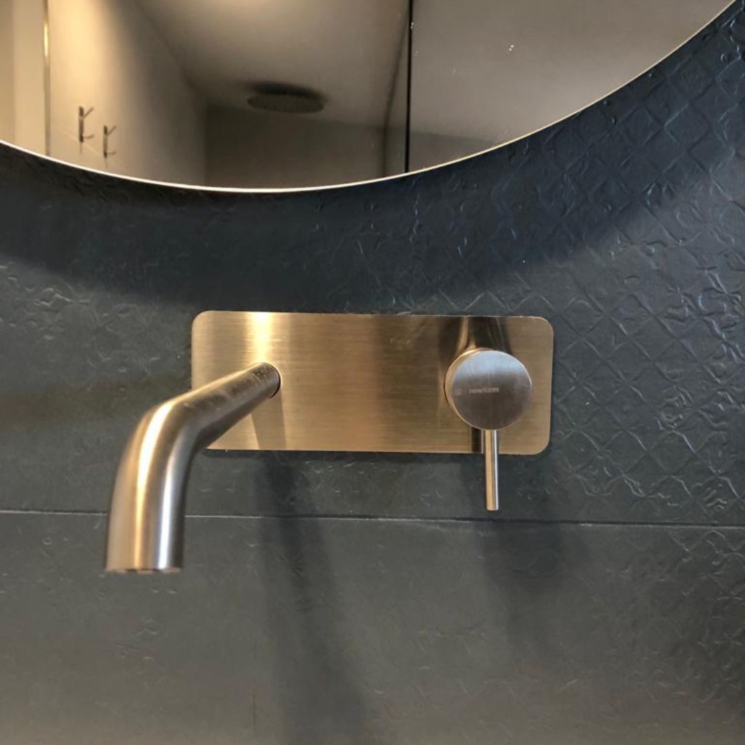 I sanitari Cielo opaco si integrano perfettamente con la rubinetteria in nickel con trattamento PDV Newform. Il mobile con base d’appoggio ospita il lavabo opaco Artesi, combinando funzionalità e stile per un bagno moderno e raffinato.