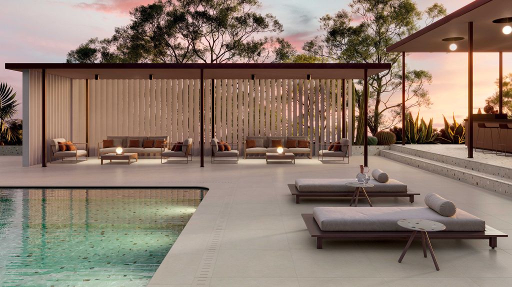Le superfici dedicate all’outdoor firmate Italgraniti vedono al centro la collezione OPEN di piastrelle in gres porcellanato spessore 2cm.