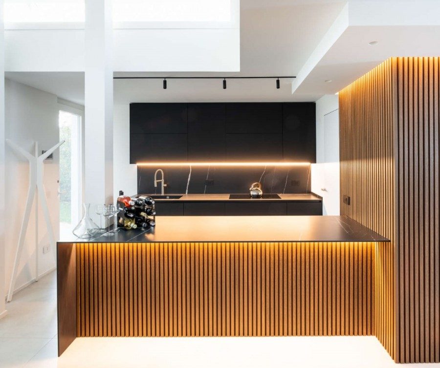 pannelli di Twix possono essere applicati sulle basi della penisola della cucina, accostando in maniera molto piacevole il legno e il marmo che caratterizza l’eventuale piano di appoggio. Attraverso questa contrapposizione di materiali possiamo generare degli effetti di luce davvero speciali, che evidenziano tutti gli elementi che non devono passare inosservati.
