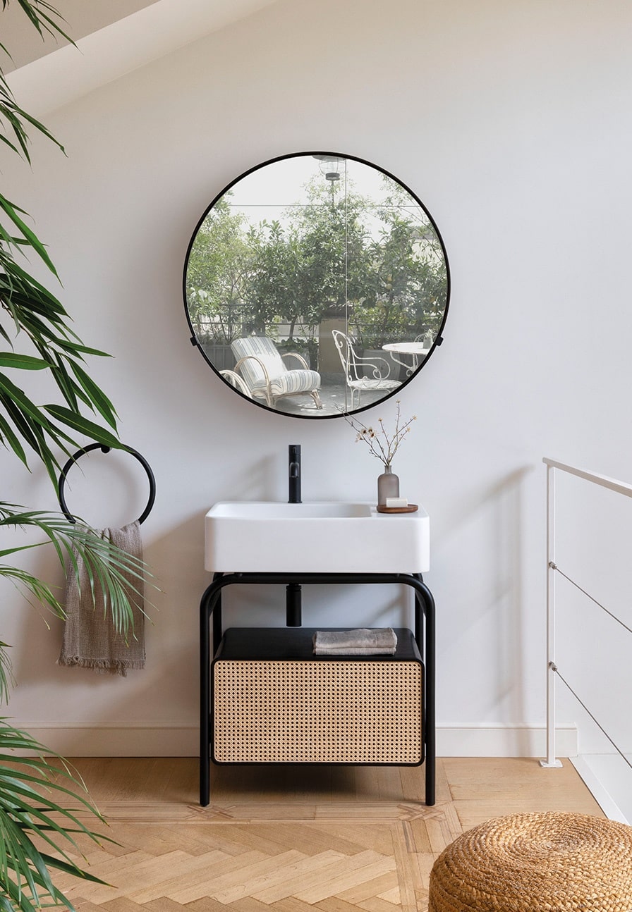 Le forme sinuose e razionali del Bauhaus incontrano l’essenzialità dei mobili in legno massello curvato e paglia della famiglia Thonet di Vienna, per un lavabo iconico, reinterpretato in chiave moderna. Perfetto esempio di come tradizione e innovazione possano convivere divinamente.